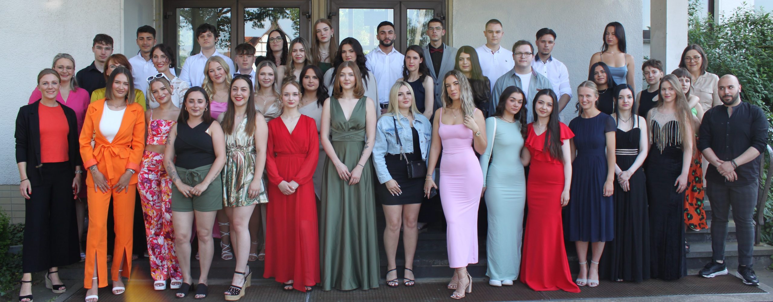 Lehrende, Freunde und Angehörige feierten die Absolventinnen und Absolventen der Klassen der Berufsfachschule für Gesundheit und Soziales (BFG 2), Berufsfachschule für Wirtschaft und Verwaltung (BFW 2), der Berufsfachschule für Kosmetik (BFK 1+2), der Berufsfachschule für Holztechnik (BFH 1+2) und der Staatlich geprüften Sozialassistentinnnen/Staatlich geprüften Sozialassistenten (SOA).