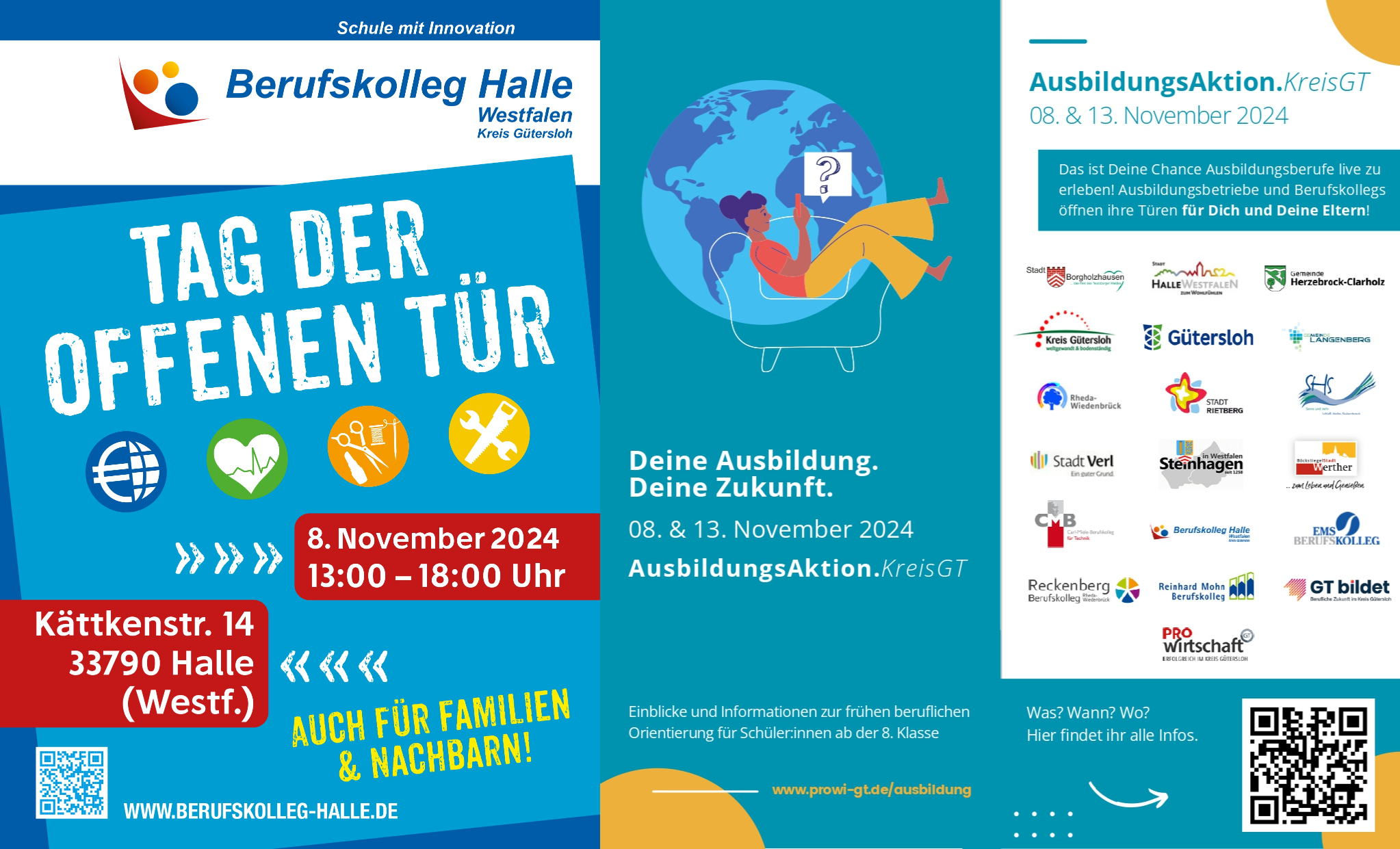 Am Freitag, den 08.11.2024 findet in der Zeit von 13:00 bis 18:00 Uhr ein ganz besonderes Event am Berufskolleg Halle (Westf.) statt! Erstmalig präsentieren sich das Berufskolleg Halle (Westf.) sowie führende Ausbildungsbetriebe der Region im Rahmen einer Ausbildungsmesse gemeinsam.