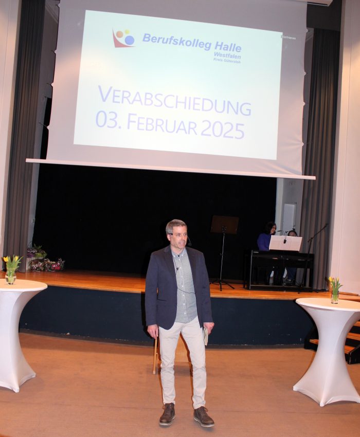 In der voll besetzten Aula führte Alexander Brinker, Bereichsleiter für die duale Ausbildung am Berufskolleg Halle (Westf.), durch das Programm des Abends. Er begrüßte alle Anwesenden und stellte die einzelnen Ausbildungsberufe noch einmal kurz vor. Alexander Brinker hob bei seinen einführenden Worten besonders hervor, dass die Ergebnisse der Prüfungen ausgezeichnet gewesen seien.