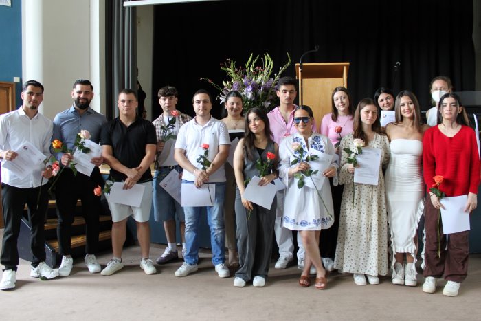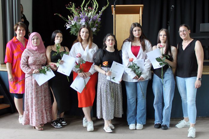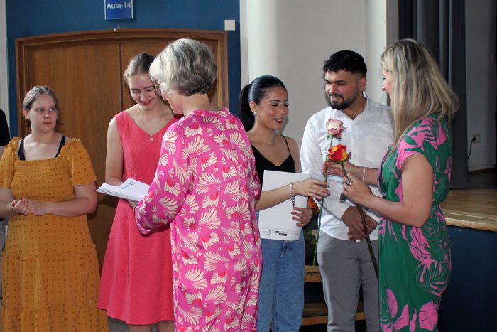 Sandra Soßnowski wählte bei ihrer Moderation immer wieder Analogien zur gerade stattfindenen Fußball Europameisterschaft. „Sie, liebe Schülerinnen und Schüler haben der deutschen Nationalmannschaft einiges voraus. Sie haben bereits das Finale gewonnen und gehen somit als Sieger aus dem Spiel heraus.“ Und zu dieser „Siegerehrung“ waren viele Eltern, Freunde und Freundinnen sowie verwandte gekommen, so dass die Aula des Berufskollegs – trotz der sehr sommerlichen Temperaturen – gut gefüllt war. Anders als bei der EM gingen bei der Zeungisausgabe alle „Mannschaften“ und „Spieler*innen“ als Sieger*innen vom Platz!