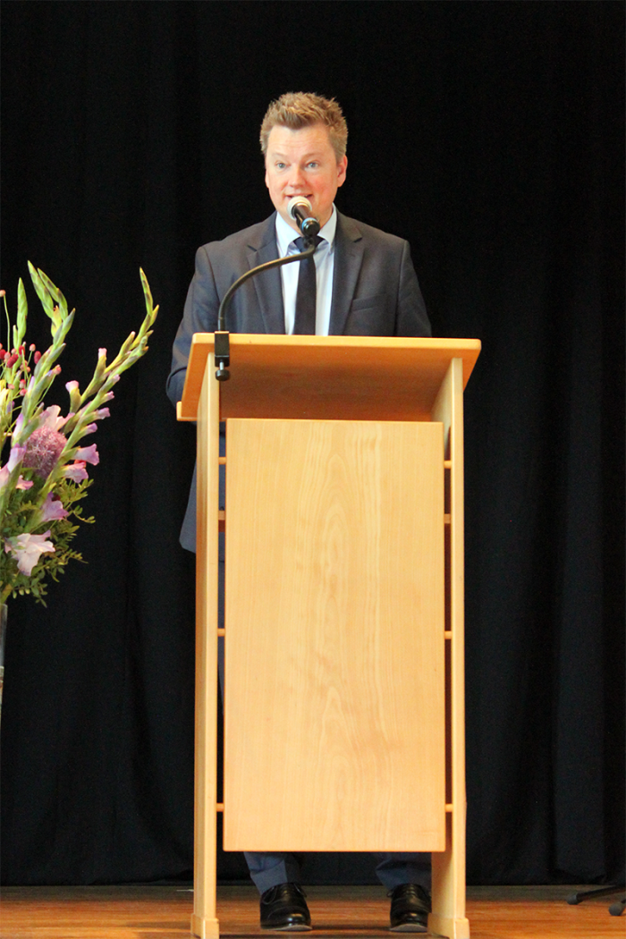 Schulleiter Nils Kralemann gratulierte den Schüler*innen zunächst zur Ihrem erfolgreichen Abschluss. Gleichfalls bedankte er sich bei den Lehrerinnen und Lehrern für die geleistete Arbeit, aber auch bei den Eltern und Familienangehörigen, die ihre Schützlinge unterstützt, den Rücken frei gehalten und auch viel Geduld gehabt hätten. Was Nils Kralemann darüber hinaus besonders freute, war die Tatsache, dass die Schüler*innen nicht nur einfach ihre Schulzeit „abgehangen“ hätten, sondern sich aktiv am schulischen Leben beteiligt hätten. Beispielsweise unterstütze die Berufsfachschule für Gesundheit den Verkehrssicherheitstag, die Berufsfachschule für Holztechnik baute die neuen Schulhofmöbel auf, die Berufsfachschule für Ernährungs und Versorgungsmanagement sorgte für Verköstigungen auf zahlreichen schulischen Veranstaltung, usw. Abschließend wünschte der Schulleiter den nun ehemaligen Schüler*innen für die Zukunft Gesundheit und Erfolg.