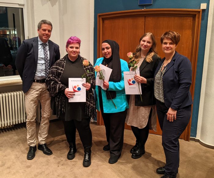 FR21, alphabetisch: Khanma Ahmad, Lea Mayr und Agata Pawela mit Klassenlehrerin Ina Hensen und Abteilungsleiter Alexander Brinker