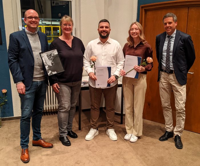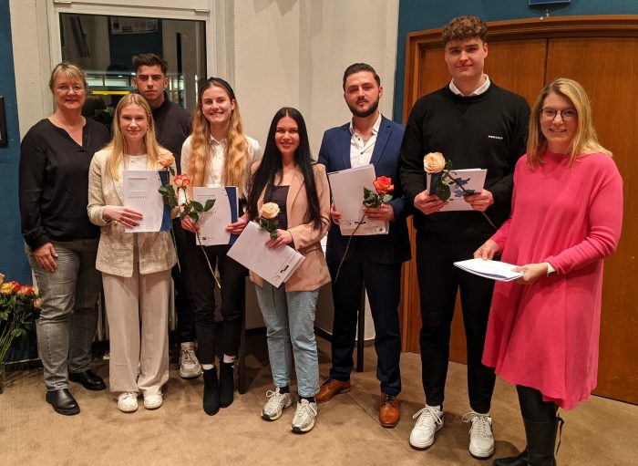 GH21, alphabetsich: Marvin Baars, Lena Kowalski und Ersin Tinastepe mit Klassenlehrer Frederik Berßen und Abteilungsleiter Alexander Brinker