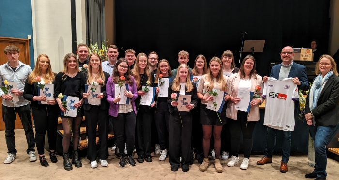 Alexander Brinker verstand sich jedoch an diesem Abend als Advokat der Jugend. Denn auf unsere Absolventinnen und Absolventen trifft dieses negative Bild absolut nicht zu. Alexander Brinker beschrieb diese als pragmatisch, orientierungssicher und gradlinig. Darüber hinaus wies er darauf hin, dass die Jugend mehr Lob und Anerkennung für ihre Leistungen verdient hätte. Denn die überwiegend hervorragenden Leistungen der Absolventinnen und Absolventen würden nichts anderes zulassen. Abschließend bedankte er sich bei den Lehrkräften, Betrieben, Eltern, Verwandten und Freunden für die Unterstützung der ehemaligen „Azubis“.