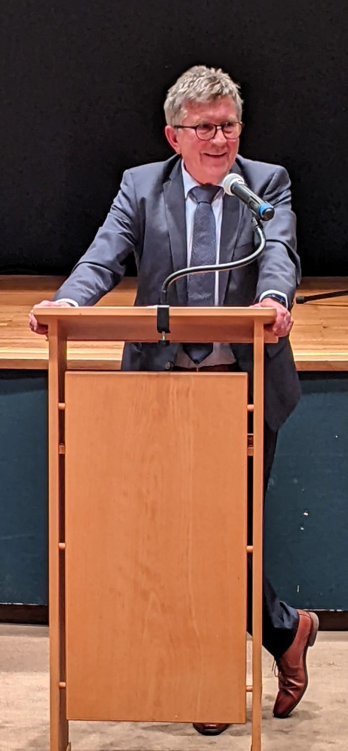 Auch Schulleiter Dietmar Hampel gratulierte den ehemaligen „Azubis“ zu ihren Erfolgen. Für Dietmar Hampel war es die letzte Rede dieser Art, da er am 31.01.2024 in den Ruhestand versetzt wurde. Demgemäß gab es für die Absolventinnen und Absolventen eine Gemeinsamkeit – ein neuer Lebensabschnitt beginnt. Dietmar Hampel ging in seiner Reder auf die Kompetenzen ein, welche Unternehmen und Betriebe erwarten: Fachliches Know-How, Teamarbeit und Kommunikationsfähigkeit, Selbstständigkeit und Eigeninitiative, Flexibilität und Anpassungsfähig sowie Problemlösefähigkeiten. Dietmar Hampel war sich sicher, dass die Absvolventinnen und Absloventen im Rahmen ihrer Ausbildung sehr gut entwickelt haben. Abschließend wünschte er den Absolventinnen und Absolventen für die Zukunft Erfolg und Gesundheit.