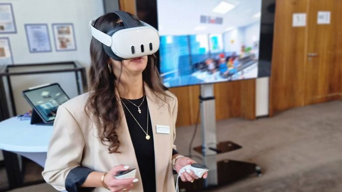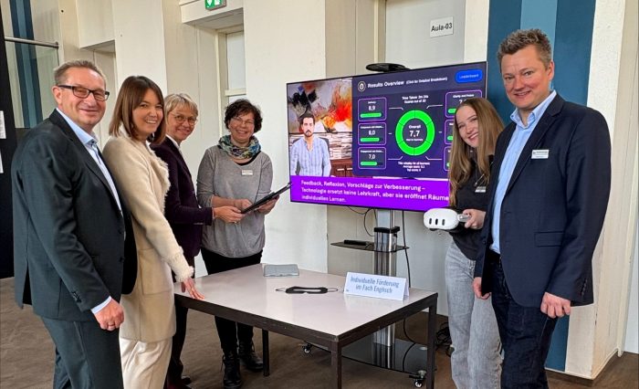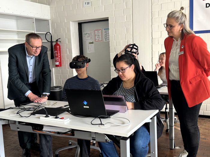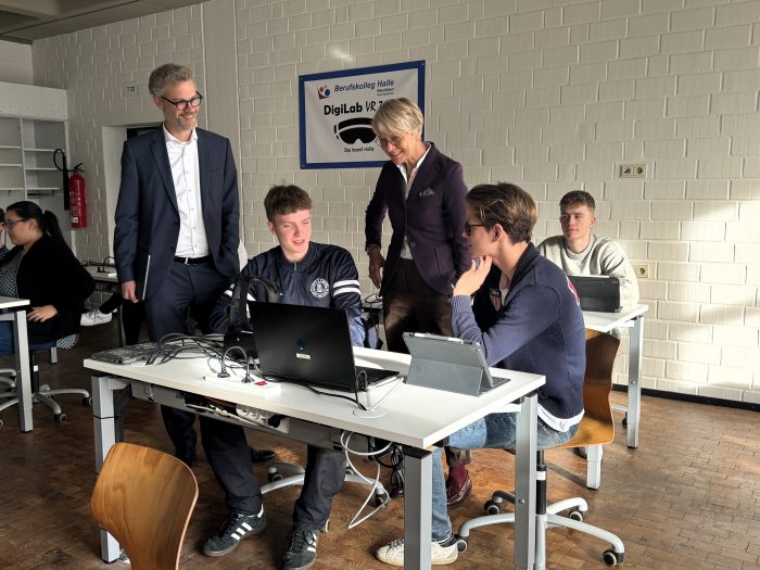 Das Berufskolleg Halle (Westf.) gehört zu den Schulen in NRW, die digitale Medien nicht nur als Ergänzung, sondern als integralen Bestandteil moderner Unterrichtskultur verstehen. Im November 2022 wurde das sog. DigiLab am Berufskolleg eröffnet. Gleichfalls wurde der Einsatz der VR-Technologie stetig von Grupper engagierter Lehrkräfte weiterentwickelt. Dieses Engagement rief nun auch die Schulministerin, Dorothee Feller, auf den Plan, welche sich Vorort die unterschiedlichen VR-Projekte ansah.