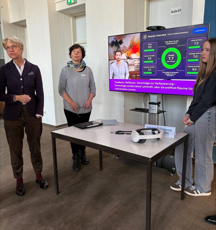 Einen weiteren Einblick boten Katharina Henkel (komm. Fachleiterin am ZfsL Bielefeld) und Lehramtsanwärterin Svetlana Schulmeister. Mit Hilfe digitaler Simulationen werden Unterrichtssequenzen analysiert und reflektiert, um Auftreten, Kommunikation und pädagogische Professionalität gezielt zu stärken. VR eröffnet hier sichere Trainingsräume, in denen angehende Lehrkräfte Feedback erhalten und ihre Kompetenzen erproben können.
