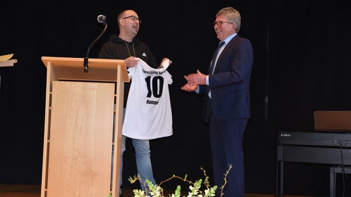 Anschließend bekam er von Benjamin Henkel ein Mannschaftstrikot mit den Unterschriften des Kollegiums überreicht.